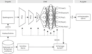 Abbildung 1: Trainingszyklus unseres CNNs. Das CNN sagt vorher, mit welcher Wahrscheinlichkeit eine Aufnahme den jeweiligen Genres entspricht. Anhand der gepaarten Beispiele aus Aufnahme und tatsächlichem Genre lernt es mit der Zeit, korrektere Vorhersagen zu treffen.