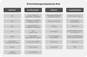 Die in den Beispielen beschrieben Funktionalitäten stellen nur einen Teil von dem vor, was mit Max möglich ist. Darüber hinaus können beispielsweise Arduino Boards über serielle Kommunikation angesteuert, mit Mira Benutzeroberflächen zur Steuerung von Max-Patches mit dem iPad entwickelt und mit den RAVE (Realtime Audio Variational neuralen Audiosynthese durchgeführt werden. Abbildung 8 gibt eine Übersicht zu den technologischen Möglichkeiten in der Entwicklungsumgebung Max.