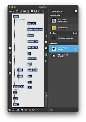 RNBO verhält sich als visuelle Sprache ähnlich zu Max. Der Unterschied besteht in den Exportoptionen des gepatchten Signalflusses: Dieser kann als AU/VST3-Plug-in, für Raspberry Pi, als C++-Quelldatei sowie für Browser- Anwendungen exportiert werden. Der Plug-in-Export wird mit dem weit verbreiteten C++-Audio-Framework JUCE realisiert, das auch für die Entwicklung von Max verwendet wird.