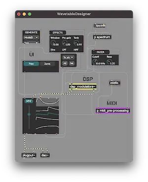 Beim 3D-Synthesizer-Projekt bin ich an eine Grenze der Max-Objekte gestoßen: Mit dem [2d.wave~] Objekt kann man zwar durch mehrere Wavetables morphen, der im Objekt enthaltene Oszillator ist aber nicht Aliasingfrei. Glücklicherweise stellt Cycling 74‘ mit der Max API und dem min-devkit Frameworks zur Verfügung, um mit C, bzw. C++ eigene Objekte (Externals) zu schreiben. Dabei lassen sich neben Signalverarbeitungsalgorithmen auch UI-Elemente unter Verwendung der OpenGL-Spezifikation entwickeln. So war es mir möglich, ein External zur aliasing-freien, morphbaren Wavetable-Synthese inklusive Visualisierung zu schreiben.