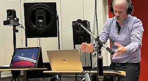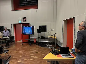 In eindrucksvoller Weise eröffnete Ulrich die Veranstaltung mit einer Premiere: Am Beispiel eines kurzen Stückes von Antonín Dvořák demonstrierte er, wie er von Köln aus live über eine Standard-Internetleitung Musiker an verschiedenen Stellen in den Niederlanden synchron dirigiert. Die Bewegungen der Hände werden in diesem Setting, derzeit in einer Beta-Version, datenreduziert schemenhaft übertragen. Wir konnten derweil die Musik über eine Anlage, die Kollege Michael Morawietz dankenswerterweise aufgebaut hatte, genießen.