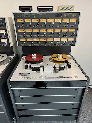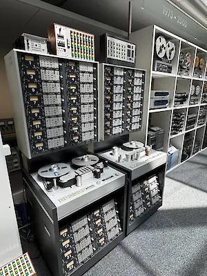 Dort gibt es neben einigen sehr gut erhaltenen Revox-Geräten viele Sonderausführungen und natürlich die für uns besonders spannenden Profi-Maschinen, die unter dem Namen Studer weltweite Bedeutung hatten (und in einigen Studios nach wie vor haben). In einem ursprünglich als Hotel geplanten Komplex wurde ein Bürogebäude konzipiert. Nun birgt die eigentlich als Foyer gedachte, ca. 1000 Quadratmeter große Halle eine stattliche Anzahl an Geräten, die Studer einst produziert hat. Fast durchweg in einwandfreiem, lauffähigem Zustand präsentieren sich Tonbandmaschinen von 1⁄8-Zoll hin zu den großen analogen 2-Zoll/24-Spur-Geräten, endend mit 48-Spur-Digitalmaschinen. Daneben sind Mischpulte unterschiedlichster Bauart zu entdecken.